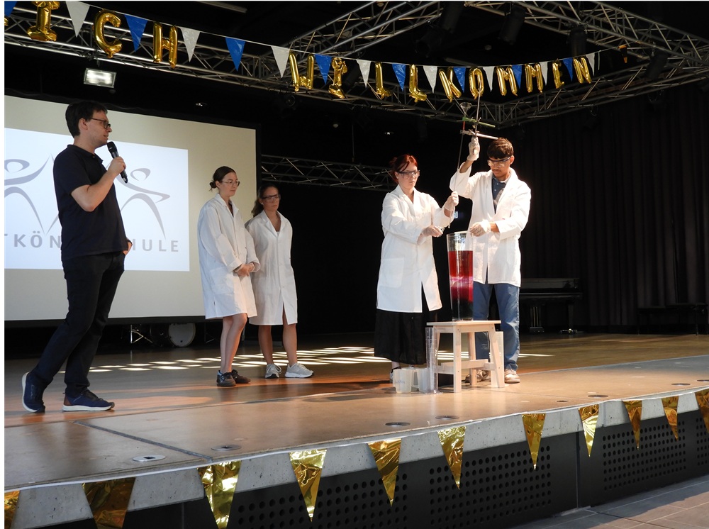 Tatsächlich bietet die Schule mit ihren drei Schwerpunktsetzungen Raum für die vielfältigen Begabungen der Kinder. Während die Schwerpunkte „Musik“ und „Sport“ schon länger Argumente waren, um auf die AKS zu gehen, macht die dem Excellence-Cluster zugehörige Schule auch allen jungen Naturwissenschaftlern ein attraktives Angebot mit ihrem MINT-Schwerpunkt. Der gerade erst eingeweihte MakerSpace und die AG dazu runden das Angebot ab. Auf der Feier gab es natürlich auch Vorführungen der Schwerpunktfächer. Besonders beeindruckten dabei die Bläser der Klasse 6, die unter der Leitung von Isabella Spona die Einschulung musikalisch eröffneten, sowie das Ensemble aus Streichern und Choryfeen (beide ebenfalls Kl. 6), für die Vera Stahlbaum und Wolfram Gaigl verantwortlich zeichnen, das die Weise „Vois sur ton chemin“ anstimmte. Welch Leistung nach gerade einem Dreivierteljahr Praxis!