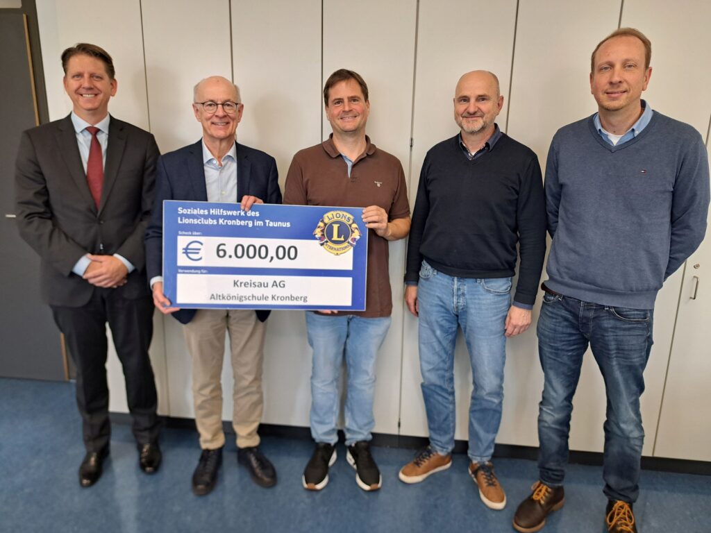 Angesichts der stets steigenden Kosten denken die Projektverantwortlichen Martin Fichert (Fachbereichsleiter) und PoWi-Lehrer Daniel Keiser jedoch schon heute an die Fahrt im September 2026 und sind daher überglücklich, sich auch in diesem Schuljahr von den Lions unterstützt zu wissen. So konnten sie am vergangenen Freitag einen Scheck über EUR 6000,– aus den Händen von Berthold Figgen, zuständig für das Kreisau-Projekt bei den Lions, sowie Daniel Soerensen entgegennehmen. „Lassen Sie mich Ihnen von Schulseite aufs Herzlichste für Ihre Unterstützung seit so vielen Jahren danken“, fasste Schulleiter Peppler die Freude aller in Worte.