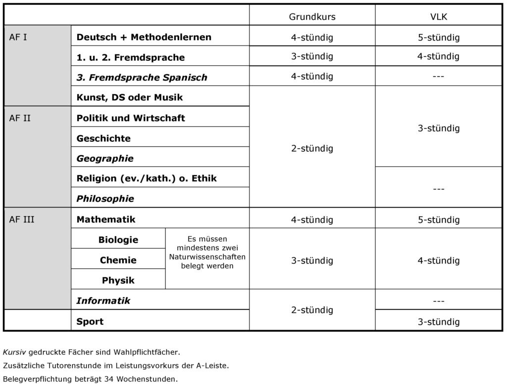- Alle belegungspflichtigen Kurse müssen, sofern sie nicht als Leistungsvorkurs gewählt wurden, als Grundkurs belegt werden (s. Stundentafel). Wahlmöglichkeiten gibt es bei den Naturwissenschaften, bei der fortgeführten zweiten Fremdsprache, bei Religion/Ethik und bei Kunst/Musik/Darstellendem Spiel.