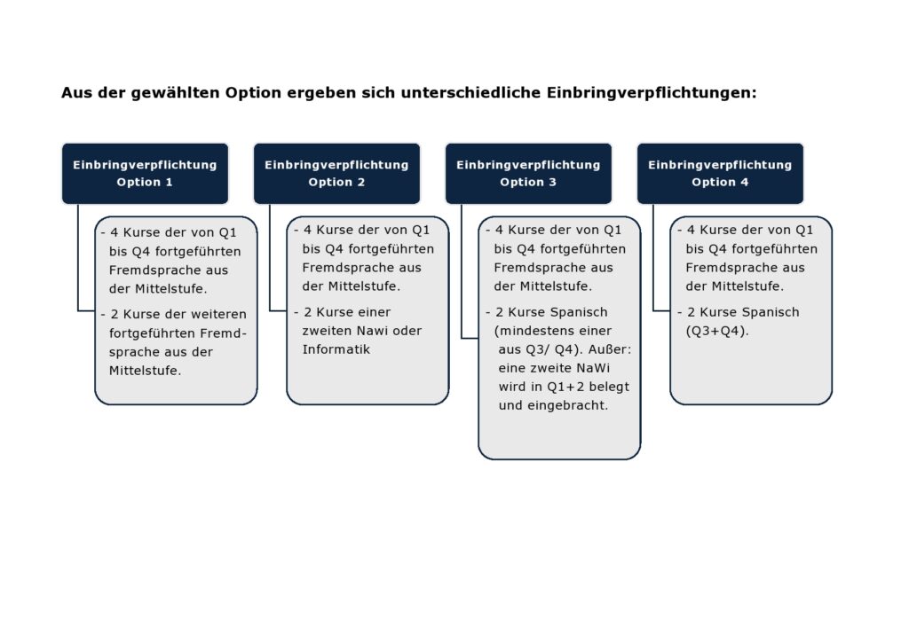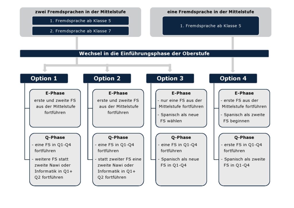 - Spanisch wird als neue Fremdsprache angeboten (vierstündig) und ist für diejenigen Schüler*innen, die in der Mittelstufe keine zweite Fremdsprache belegt haben, verpflichtend.