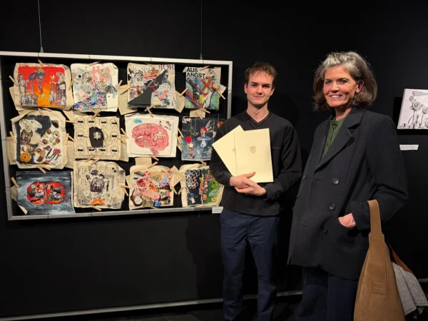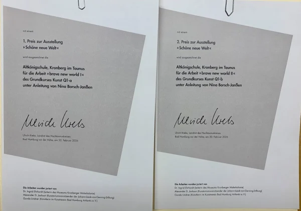 Welch fulminanter Erfolg für Kunstpädagogin Nina Borsch-Janßen und ihre beiden Grundkurse der Jahrgangsstufe 12: Während die Collage „brave new world I“ mit dem 1. Preis zur Jahresausstellung der renommierten Kunstgalerie Artlantis ausgezeichnet wurde, erhielt die Radierung „brave new world II“ den 2. Preis. „Wir haben eindeutig Potenzial, und das darf man auch sehen!“, fasst Borsch-Janßen ihre Freude in Worte. Auch wir gratulieren hierzu aufs Herzlichste, zumal acht weitere bekannte Schulen des Hochtaunuskreises an der Ausstellung mitwirkten. Noch bis Sonntag, den 08.03.2026, können die Exponate in den Räumlichkeiten des Tannenwaldwegs 6 in Bad Homburg betrachtet werden.