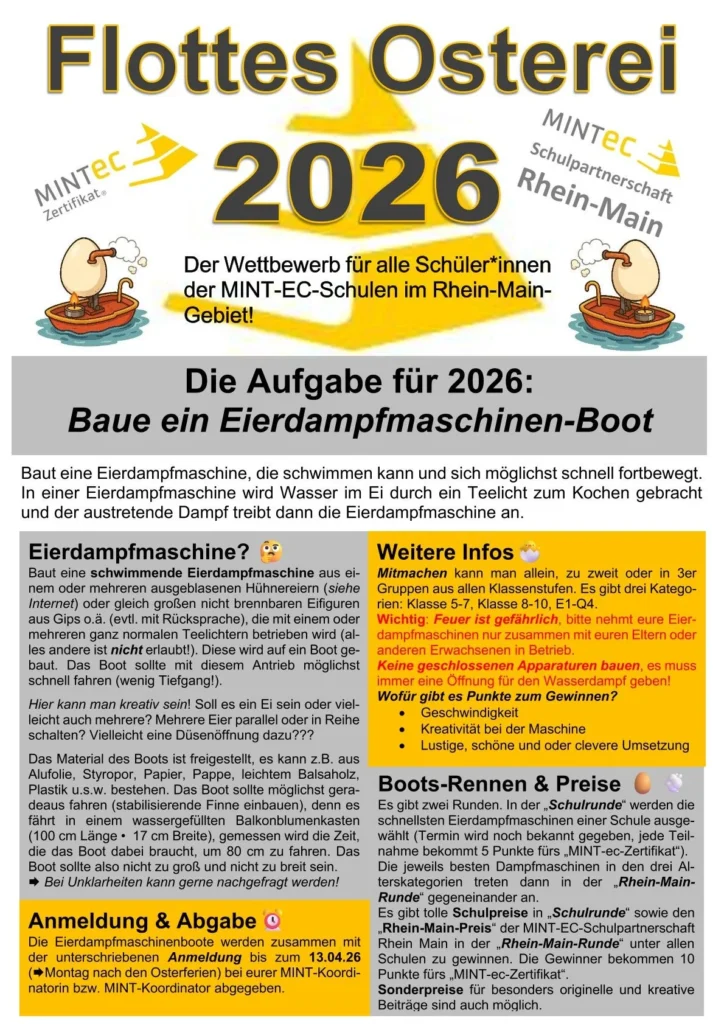 Die Aufgabe für 2026 lautet: Baue ein Eierdampfmaschinen-Boot.  Weitere Infos auf dem Plakat.